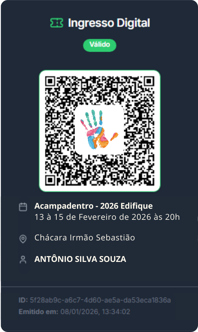 Os inscritos receberão a confirmação da inscrição via email e deverão apresentar o comprovante de inscrição (QR CODE recebido no email de compra) impresso ou no formato digital a partir do dia 01/02 na biblioteca da igreja e retirar a sua pulseira, que deverá ficar no braço durante os 03 dias do evento.